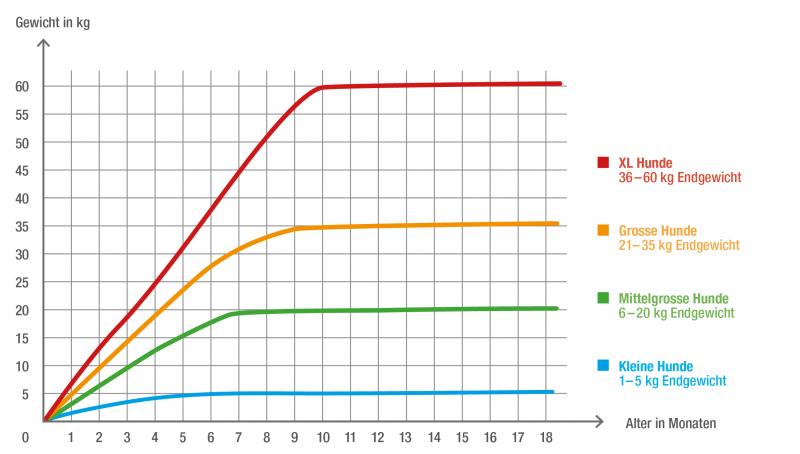 Viel verlässlicher sind Wachstumskurven. Anhand dem zu erwartenden Endgewicht können Sie ablesen, in welcher Lebenswoche der junge Hund wie schwer sein sollte. Das ist eine gute Methode, um den Ernährungszustand eines heranwachsenden Hundes zu überprüfen.